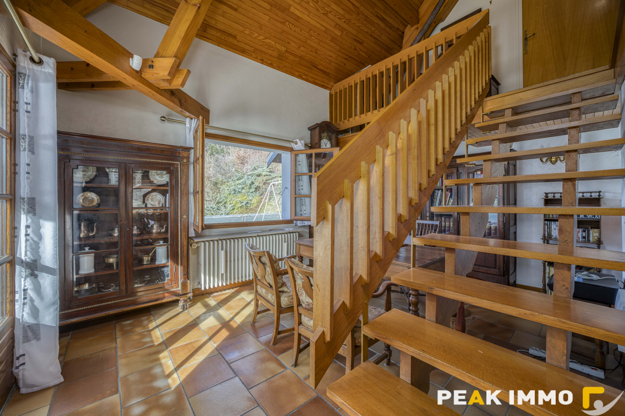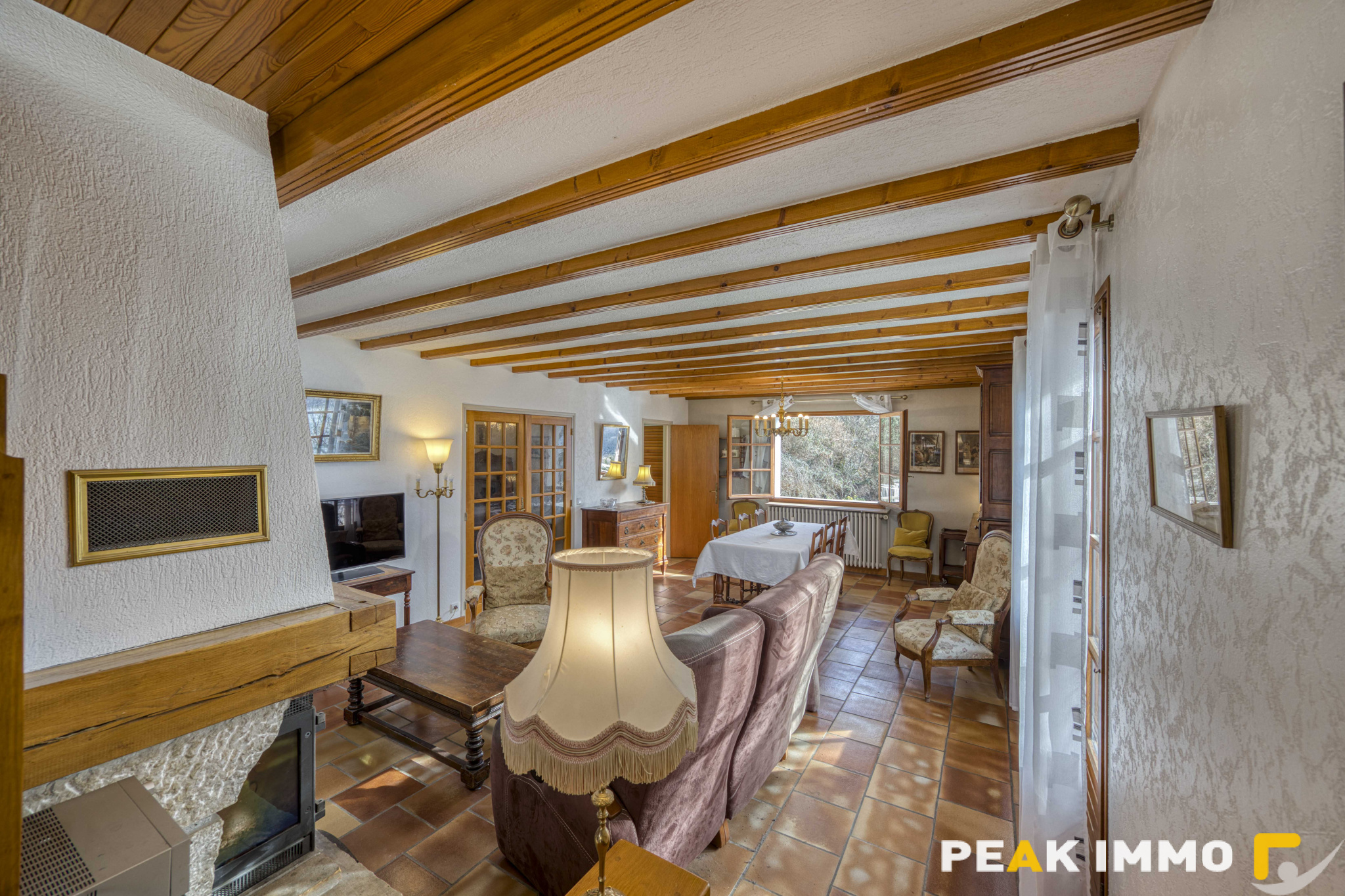 Dès l’entrée, le ton est donné : un vaste espace de vie baigné de lumière, composé d’un salon et d’une salle à manger avec cheminée, s’ouvrant par de larges baies vitrées sur un panorama à couper le souffle. La vue embrasse le lac et la Réserve naturelle du Bout du Lac, offrant un spectacle permanent au fil des saisons.