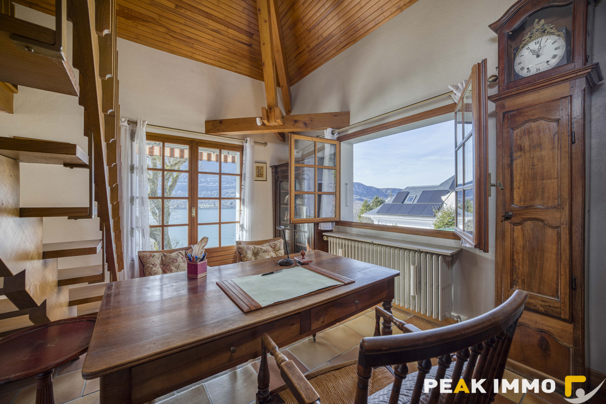 Un superbe bureau avec vue panoramique sur le lac constitue un lieu idéal pour le télétravail, un atelier d’artiste ou un salon intimiste.