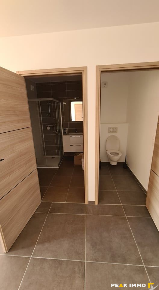 L’appartement comprend une entrée avec placard aménagé, un séjour ouivert sur une cuisine équipée, une chambre avec placard aménagé, une salle de bains avec WC et un balcon de 12,84 m2.