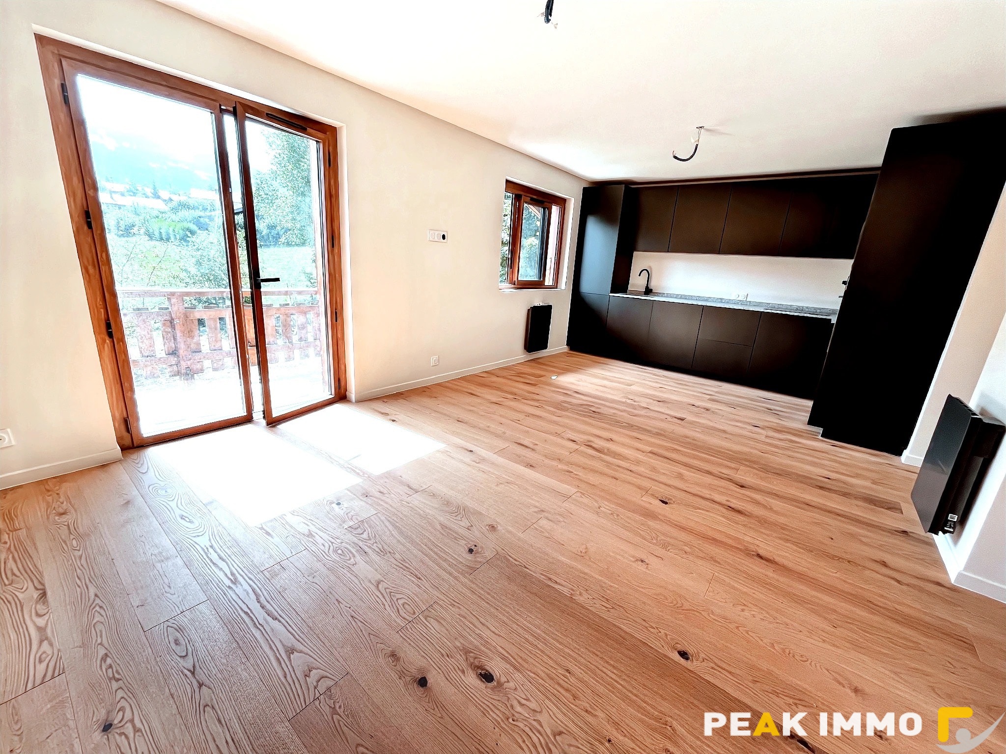 La belle pièce de vie, plein sud, ouvre sur un balcon avec vue. A l’étage, une chambre en suite, sous les toits, donne tout son charme à cet appartement.