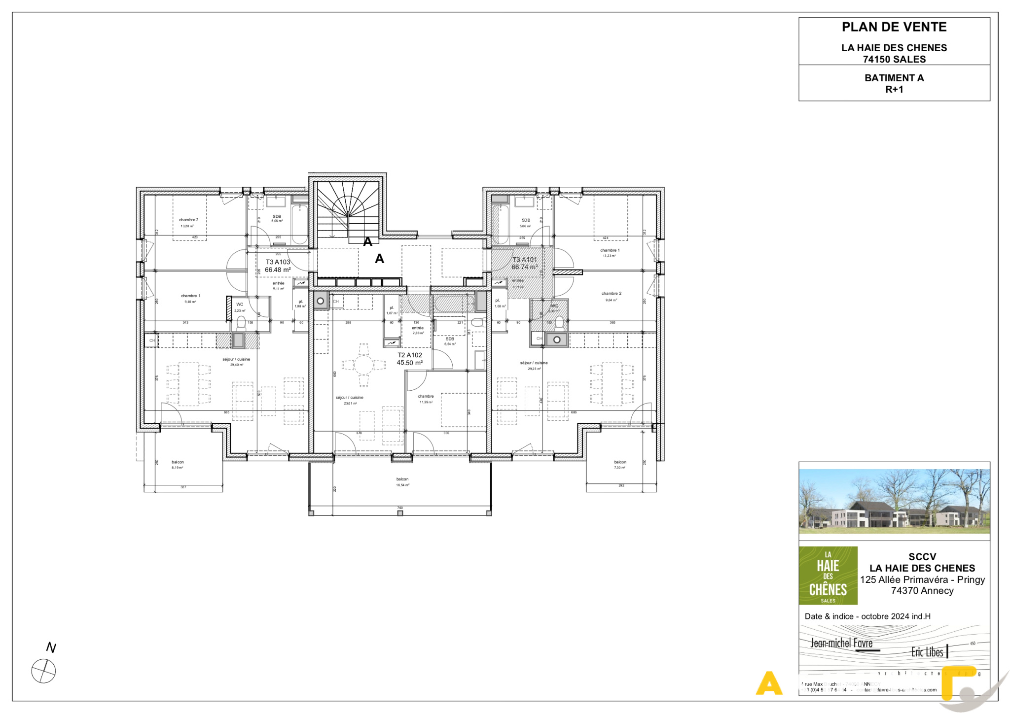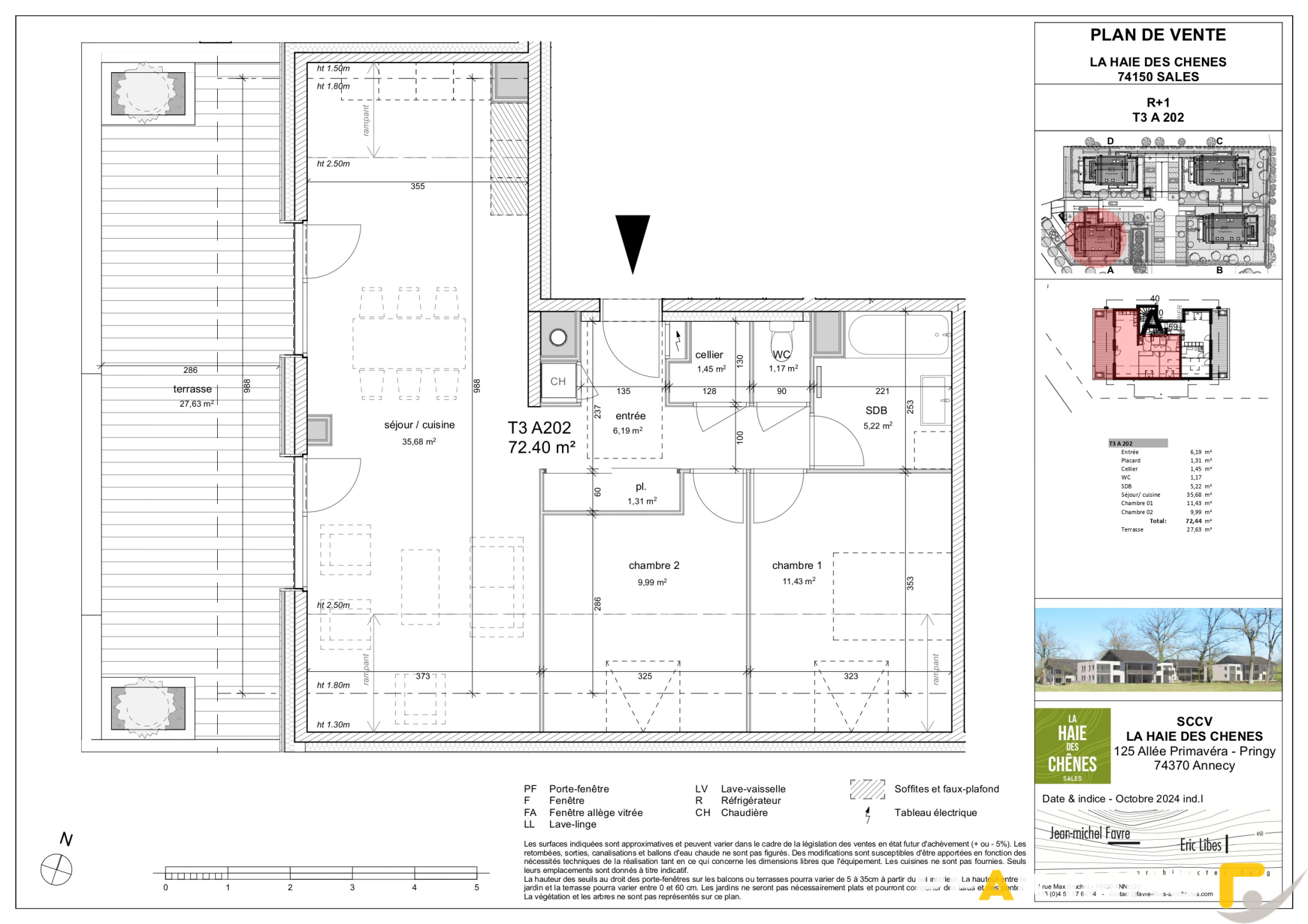 Découvrez ce vaste T3 de 72.40 m2 avec sa belle terrasse de 27.63 m2, au 1er étage de la résidence La Haie des Chênes, à Sales. Il se compose d’une entrée avec placard et cellier, une grande pièce de vie de 35.68 m2, 2 chambres, une salle de bain et un WC indépendant. Un garage complète ce bien en sous-sol de la résidence.