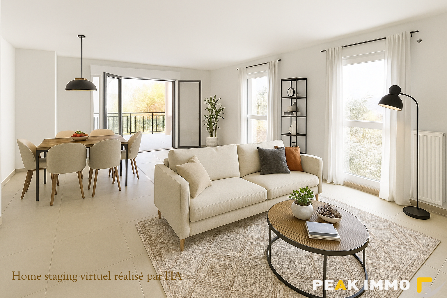 Un vaste séjour lumineux avec de larges ouvertures sur une grande terrasse de 15.74m2 exposée plein Ouest,