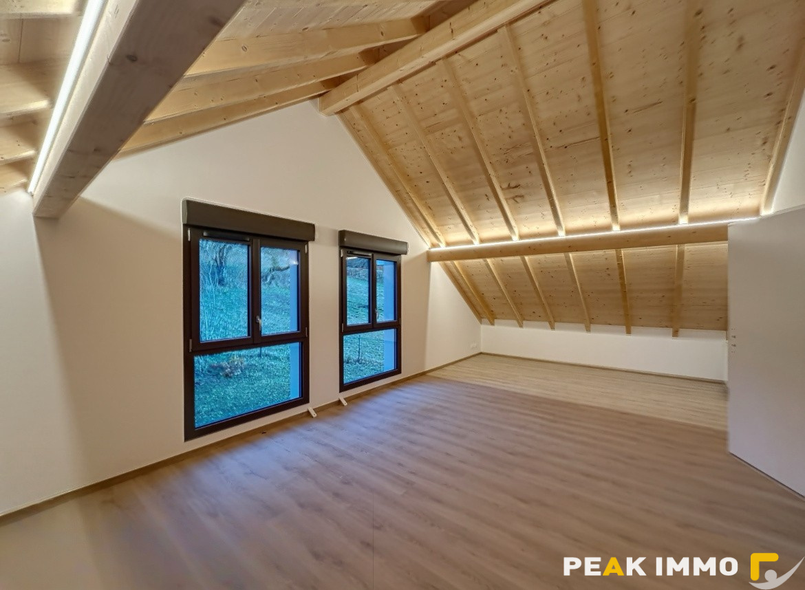 À l’étage, une mezzanine distribue trois chambres, dont deux bénéficient d’un accès à un balcon exposé sud. Une salle de bains vient compléter l’espace nuit.