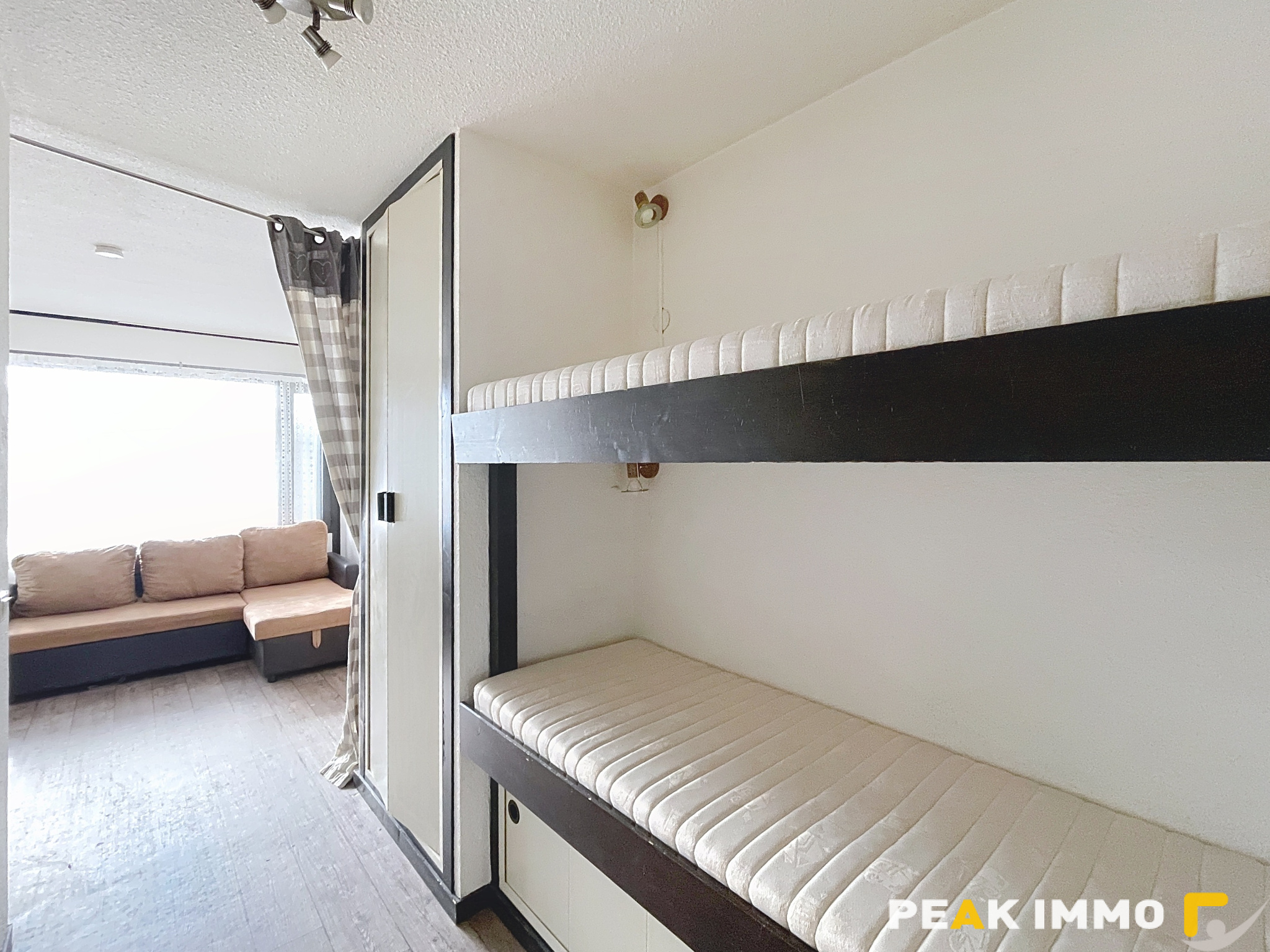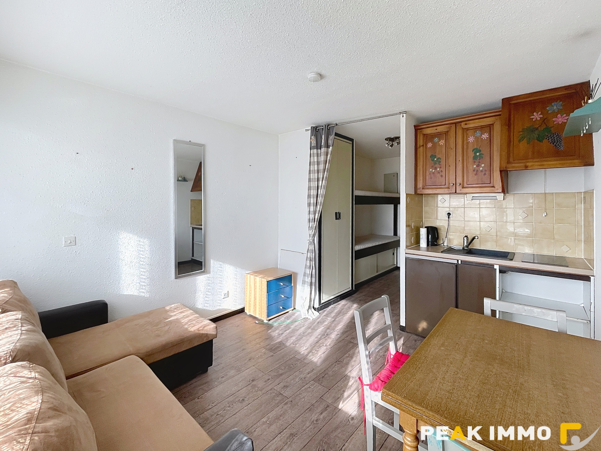 Le logement se compose d’une entrée avec rangements et deux couchages, d’une pièce de vie lumineuse avec kitchenette, ouvrant sur un balcon, ainsi que d’une salle d’eau avec WC.